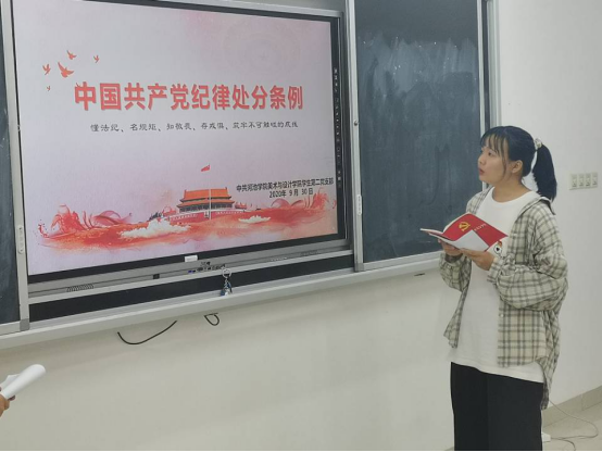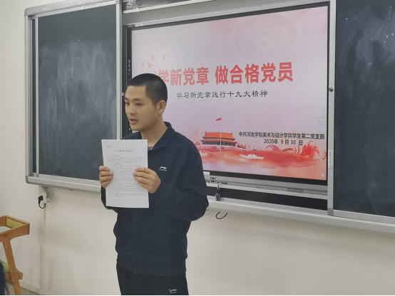 2020年9月30日下午5:30,必赢国际bwin学生第二党支部在艺术楼307教室开展了关于学习党章、《中国共产党纪律处分条例》、习近平总书记在全国疫情抗击新冠肺炎表彰会上的讲话精神三个内容党日活动会议,会议由美设院学生第二党支部支部书记申智骅同志主持,必赢国际bwin学生第二党支部全体学生党员参加活动。