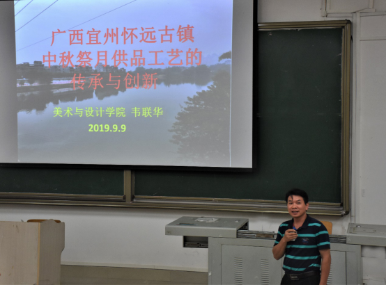 启动仪式后,由韦联华副书记主讲的《广西宜州怀远古镇中秋祭月供品工艺的传承与创新》的第一期论坛正式开讲。韦副书记以自己多年对怀远古镇祭月、赏月文化的研究和实践经验,展开了图文并茂,绘声绘色的阐述,引起了在场师生的强烈兴趣和热烈讨论。在举行论坛的过程中,韦副书记还就即将在本周末举办的必赢国际bwin“怀远古镇赏月、祭月文化传承与创新设计大赛”作了方案解释和工作布置。