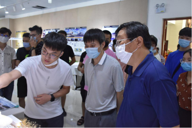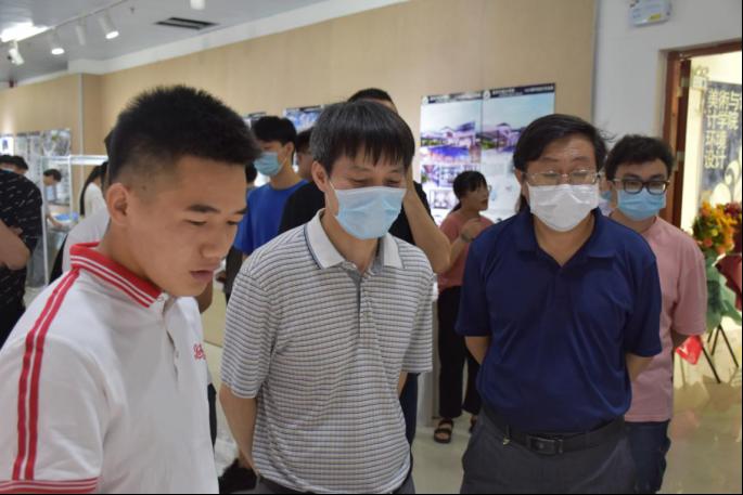 图为吴志鸿书记(右一)和罗起联院长(右二)参观学生毕业设计展