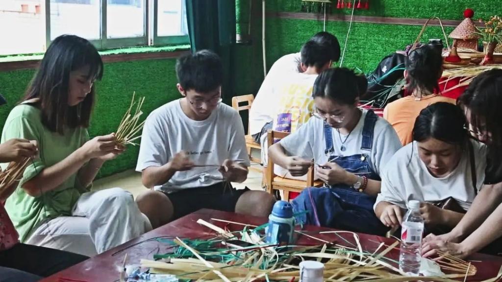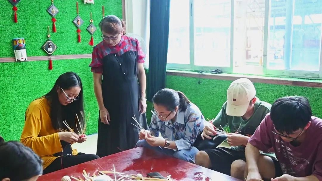 活动中,毛南族花竹帽编织技艺传承人谭素娟和覃敏向学生们讲解了毛南族手工编织技艺的特点和编织流程,同时把毛南族编织技艺的详细步骤教授给学生们。学生们也虚心求教,在向老师请教完问题后,耐心地编织自己手中的手工艺品,仔细地结形、编织、填衬,在学习中亲身感受非遗文化的独特魅力。