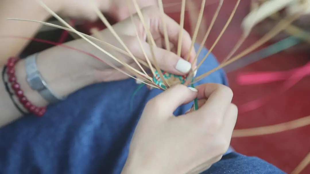 技艺传承人谭素娟和覃敏正在指导学生如何编制花竹帽