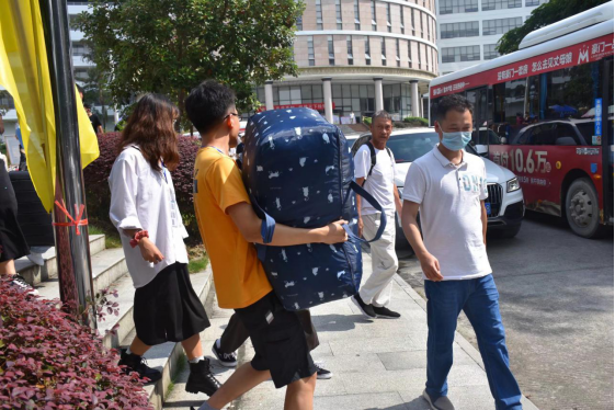 (学生干部与志愿者们帮助新生运送行李至新生宿舍)