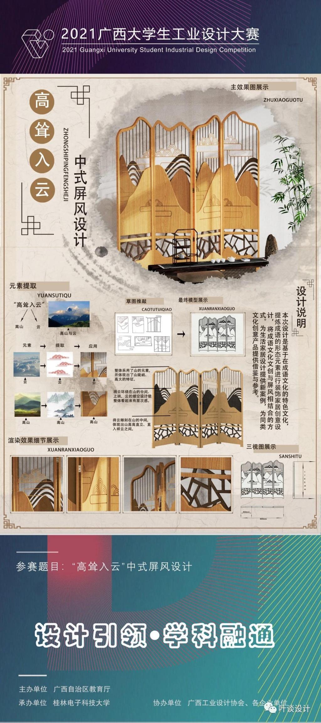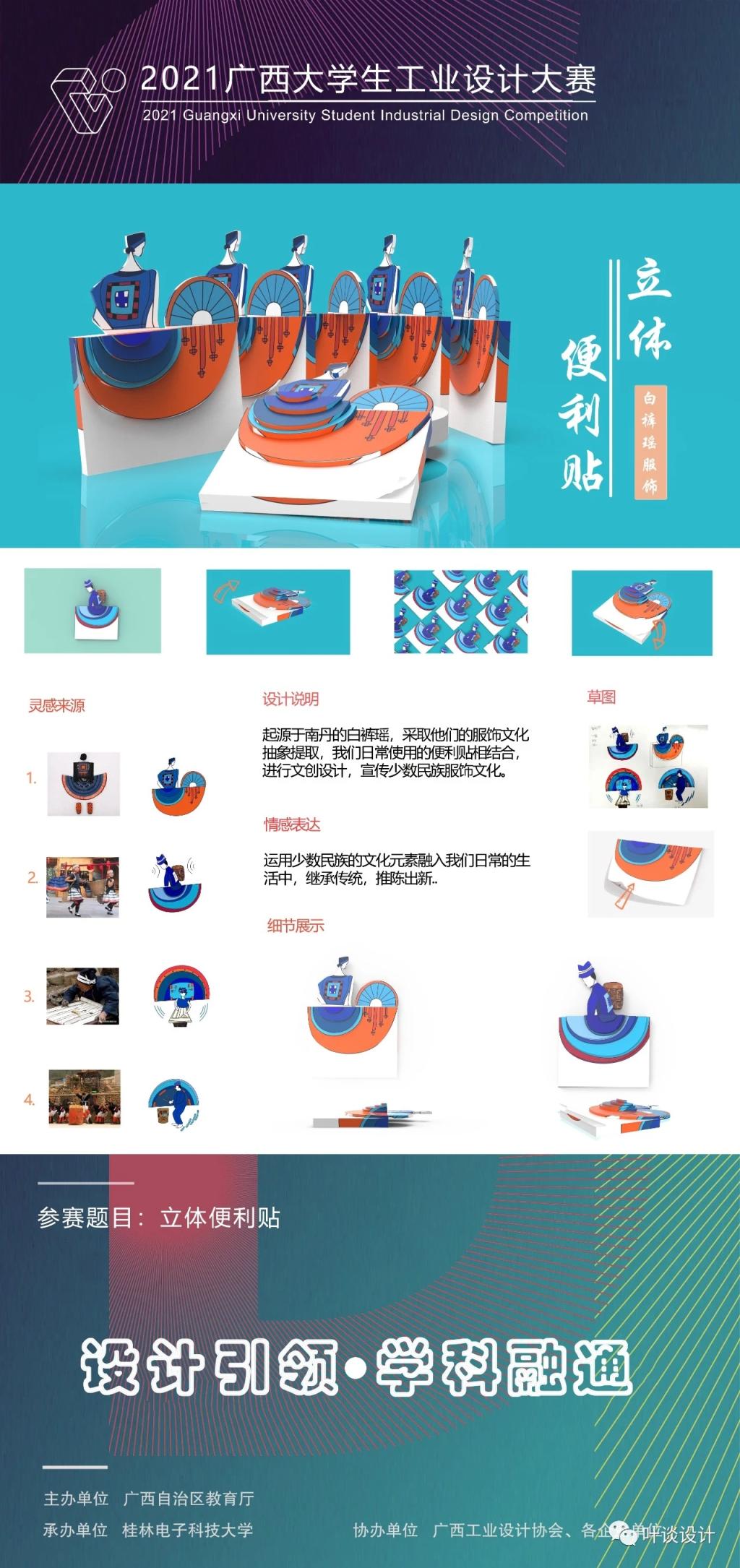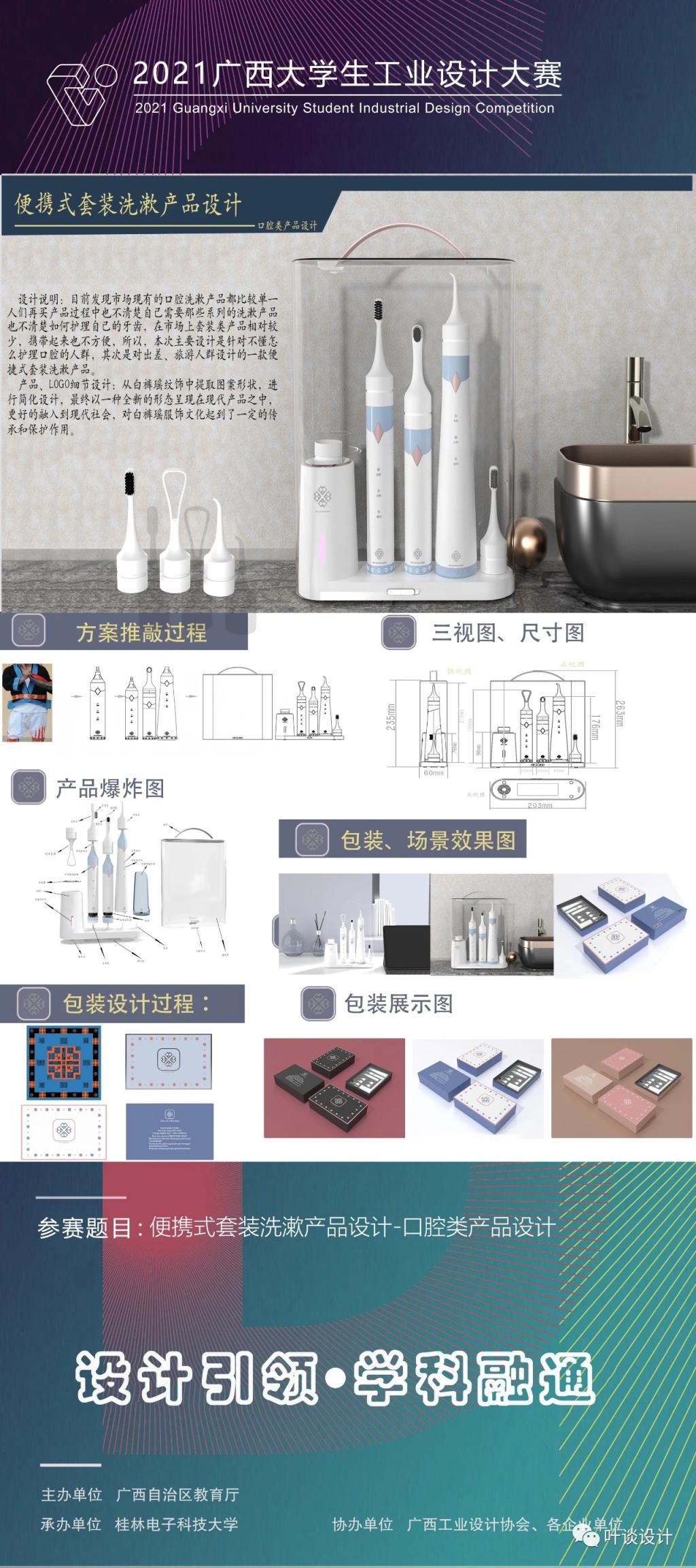 2021年我区教育厅举办28项大学生学科专业竞赛,第九届广西大学生工业设计大赛是教育厅所列比赛项目之一,由自治区教育厅主办、桂林电子科技大学艺术与设计学院承办。于2021年6月启动,共收到来自区内31所高校9355件作品,共评出一等奖393件,二等奖744件,三等奖1195件,优秀指导老师67名,优秀组织奖10所学校。
