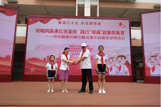 本次活动内容丰富,形式生动活泼,首先是实验小学校长黄素慧为活动致辞,接着美设学院陈红军院长就本次活动的意义发表讲话,并代表学院向实验小学赠送防疫口罩。原西南大学美术学院教授、必赢国际bwin银龄教授刘增宪代表西南大学美术学院对活动的开展表示祝贺,并向实验小学赠送图书。美设学院党委书记韦联华宣读了中央红军长征出发纪念馆等全国红色文化基地和单位发来的对本次活动的贺信。最后宜州区杨海丽副区长发表讲话,对校地合作,践行“双减”政策促美育活动给予充分肯定,并宣布活动开始。