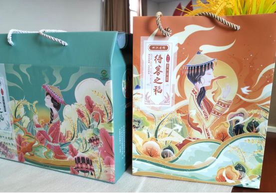 环江香糯是环江县五香物产之一,主产区位于环江毛南族自治县明伦镇、东兴镇、龙岩乡、驯乐乡的高寒山区和洛阳镇的文雅村。其米质优质,营养丰富,味道特香,有“一家煮饭十家香”之美称。但由于该产品地处边远山区,交通不便,销售渠道不畅,产品宣传力度不够,因此一直影响着产业的发展。如今乡村振兴村级企业和网店的兴起,该产品急需包装设计及对外宣传的问题。为此学院主动承担该项任务,将包装设计落实到毕业生毕业设计之中,李天德同学欣然接受任务,并高质量地完成了设计,以国潮包装“环江香糯"感动了长北村村干部、村合作社负责人,他们表示要收藏和使用该设计作品。《环江香糯》包装设计理念是以当下流行的国潮民族风插画的形式来展现毛南族的大米包装设计,在提取环江毛南族元素“山水”“梯田”以及“毛南族女性形象”等融入到设计中,体现了毛南族人民与自然和睦共处,展现了环江香糯的产品生长的优越环境,更能体现香糯食用的健康安全性。设计作品包含“礼盒装”“袋装”“罐装”三大组25件。
