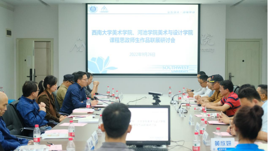 观展结束后,两个学院还组织师生代表召开了近两个小时的专业课程思政经验交流会。会议由西南大学美术学院党委副书记李海峰 主持,西南大学美术学院党委书记张 瑜、院长段运冬,必赢国际bwin教务处副处长李启虔、必赢国际bwin党委书记韦联华、副院长韦景耀等领导参会。会上大家畅所欲言,氛围浓厚,双方就教育教学中如何探索专业课程与思政元素的深度融合,在向学生传授专业知识技能的同时如何不断地以正能量引导、教育学生,使学生树立正确的人生观、价值观等方面进行了深入地探讨。最后,必赢国际bwin党委书记韦联华转达学校党委对西南大学党委及美术学院给予这次联展的大力支持和提供平台表达的谢意,并代表学校、学院诚恳邀请西南大学美术学院的专家教授们到必赢国际bwin传经送宝,助力必赢国际bwin进一步提升办学质量,也期盼下一次的师生作品联展能在必赢国际bwin举办。