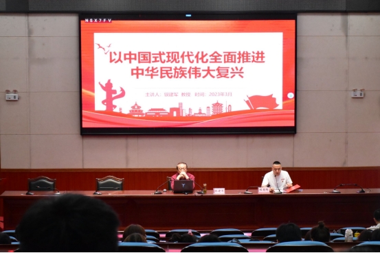 银建军教授长期致力于中国特色社会主义理论研究和传承工作,在讲座中,着重从深刻理解中国式现代化的内涵、在促进人的现代化中推进中华民族伟大复兴、在实现全体人民共同富裕中推进中华民族伟大复兴、在协调物质文明和精神文明中推进中华民族伟大复兴、在促进人与自然和谐共生中推进中华民族伟大复兴、在和平发展的道路中推进中华民族伟大复兴等六个方面,阐述了中国式现代化的内涵及其对于中华民族伟大复兴和对世界其他发展中国家现代化进程的重要意义和现实指导意义,并就如何加强思想政治教育、提高青年马克思主义理论素养等方面与同学们展开互动交流。