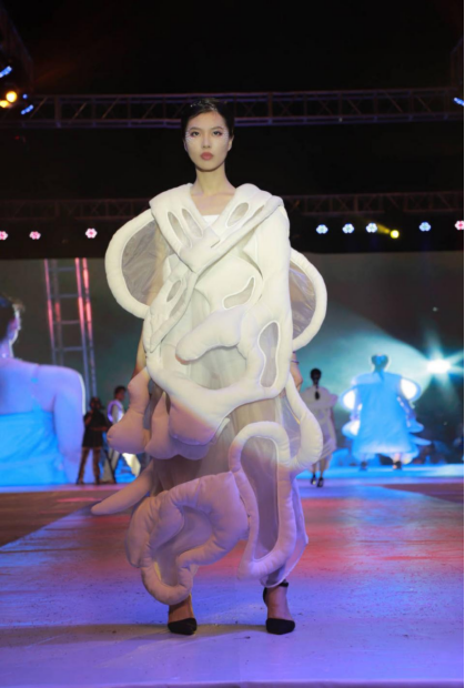 李映雨同学的毕业设计以蚕蛹形态及生长过程为灵感来设计系列作品。通过巧妙的设计手法,在服装中展现蚕蛹的生命哲学、生长形态和广西宜州桑蚕蛹的特点并且起到推广宜州桑蚕之乡的作用。希望通过此系列服装设计让更多人去对蚕蛹形态和生长过程的内涵进行思考和了解宜州桑蚕蛹丰富的文化特色。