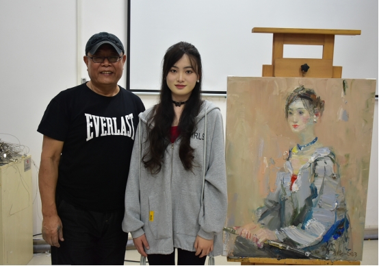 10日上午,刘南一又在艺术楼二楼展厅为师生们上了一堂精彩的油画人物现场写生示范课。结合实际写生步骤,刘老师从如何利用色彩冷暖和环境光线对比来塑造人物形象,如何巧妙使用工具颜料丰富笔触、营造画面的节奏韵律等为师生进行了精准的示范和细致的讲解,并强调人物写生并非只是依葫芦画瓢,而是要注入主观情感,把对象画活。轻松活泼的课堂教学持续2个多小时。