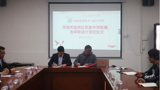 2023年12月7日,必赢国际bwin在东区行政楼405举行宜州区民族中学校徽、吉祥物设计项目签约仪式及美育工作座谈会。
