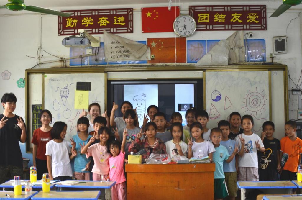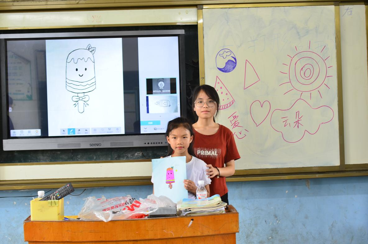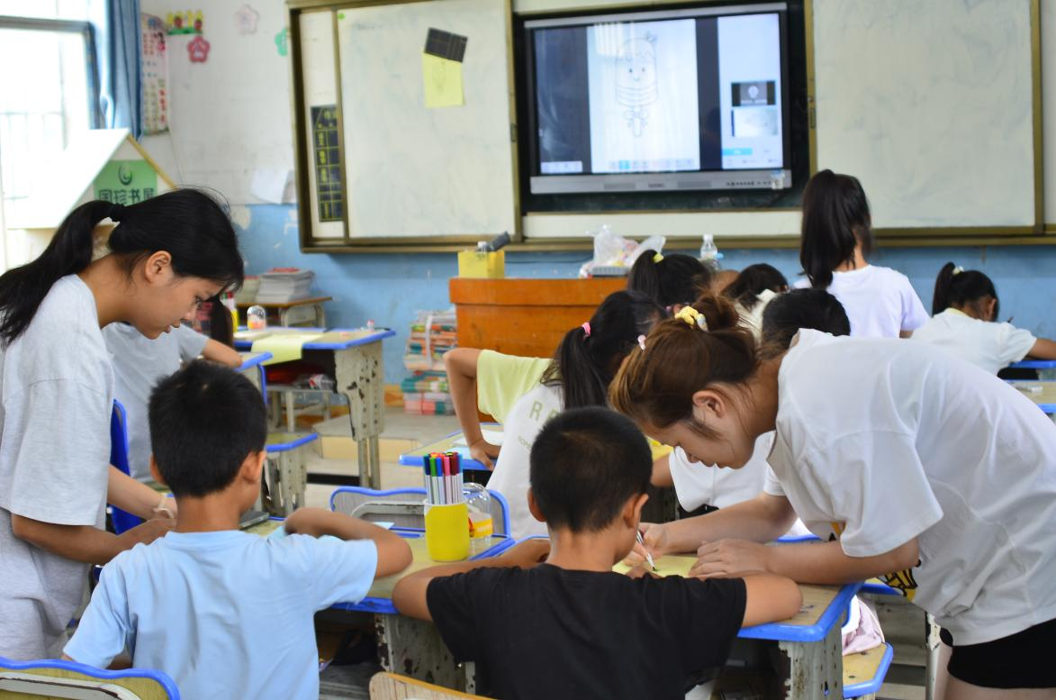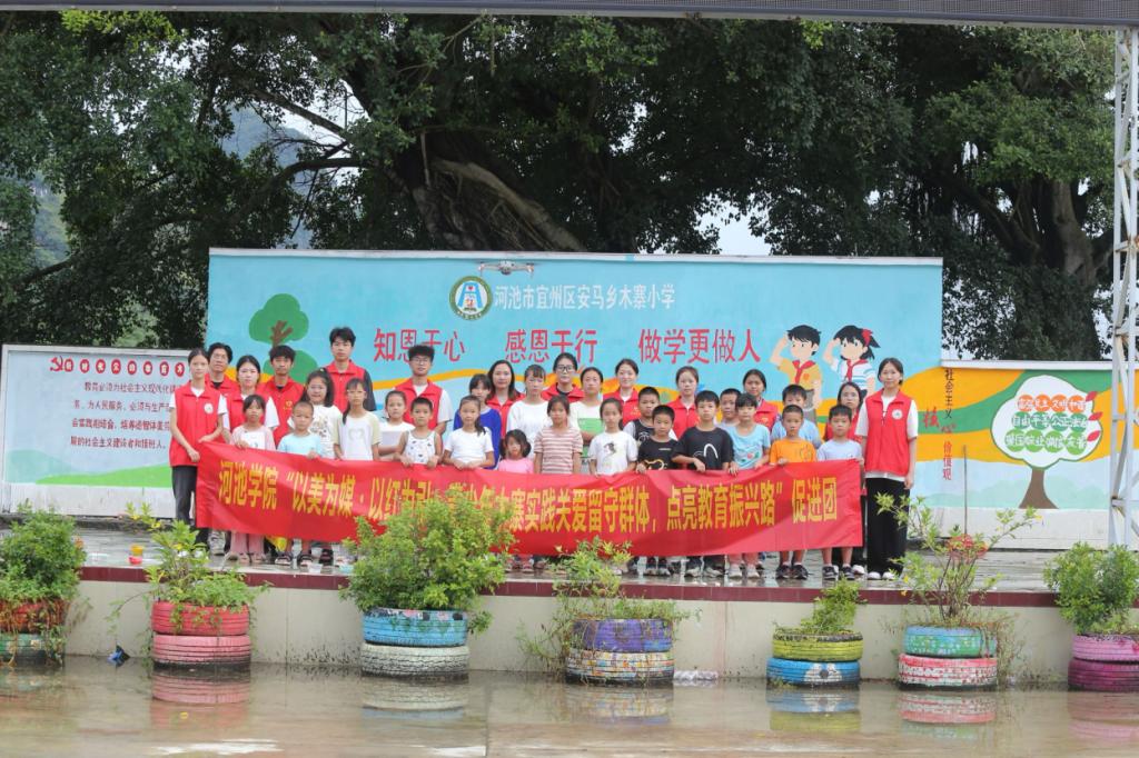 另一支“以美为媒・以红为引”实践团,聚焦留守儿童成长,将美术教育与红色文化浸润相结合。队员们到达宜州安马乡木寨小学后以画笔为桥,在互动中播撒审美种子,让红色基因通过艺术语言融入孩子们的心田,用温柔笔触守护纯真童年,为乡村教育振兴注入温暖力量。