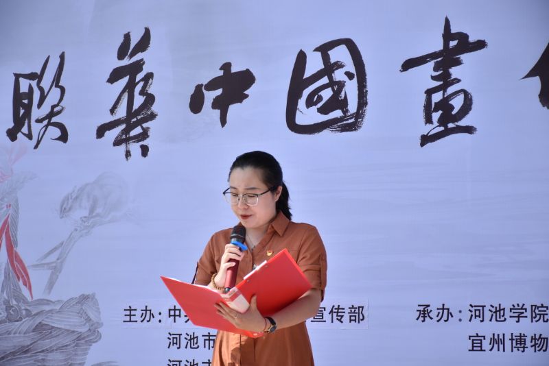 开展仪式由美设院2018级美术学专业学生李烨主持,首先由河池市文联副主席、河池市美术家协会主席廖云峰致词,其次由河池市群众艺术馆副馆长朱昌辉致词,之后由必赢国际bwin,bwin手机版,win必赢app下载副院长陈红军致词,紧接着由韦联华老师发言,再由学校领导和美术届老师为画展开展仪式剪彩。最后,由必赢国际bwin党委常委、副校长韦文广宣布画展开幕!
