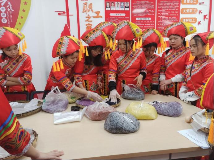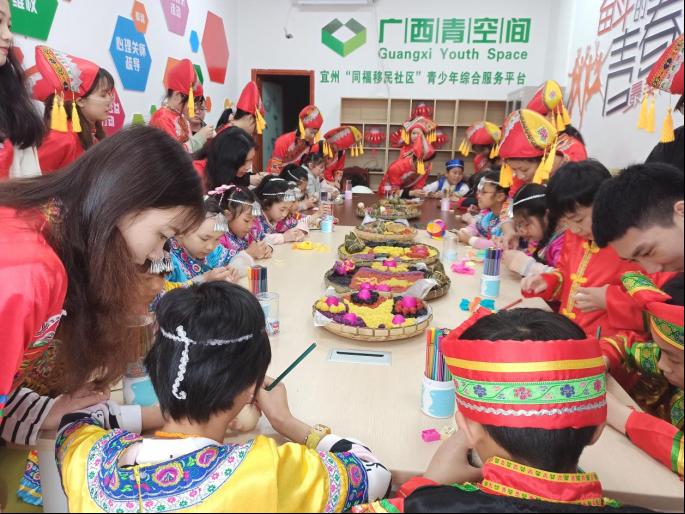 在此次支教公益活动中,美设院的同学们以建党100周年和广西壮族自治区民间艺术节三月三为主题,用本地特色食品给小朋友们做了精美的图案,有五色糯米饭、粽子、马拉糕、血肠、红鸡蛋、艾糍粑,种类丰富多彩。同学们齐心协力,大家都在很认真的制作,做好了作品端过去送给小朋友们,小朋友们一个个脸上绽满惊喜。接下来同学们教小朋友们画鸡蛋,大家认真讲解,鼓励和帮助小朋友们画出令自己满意的作品,不仅如此,还安排了娱乐活动,有壮族特色竹竿舞、板鞋竞速和滚铁圈,活动内容丰富多彩,大家都积极的参与了进来,现场的欢笑声此起彼伏,连绵不断。