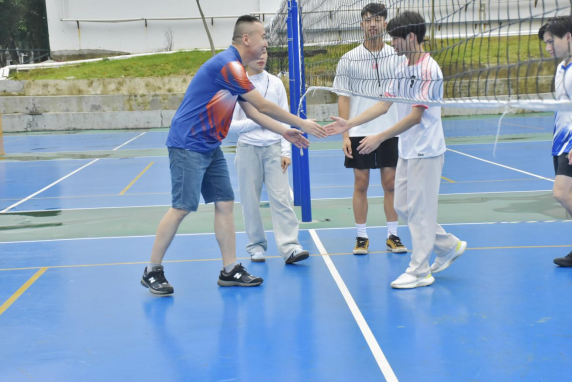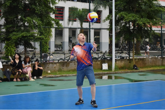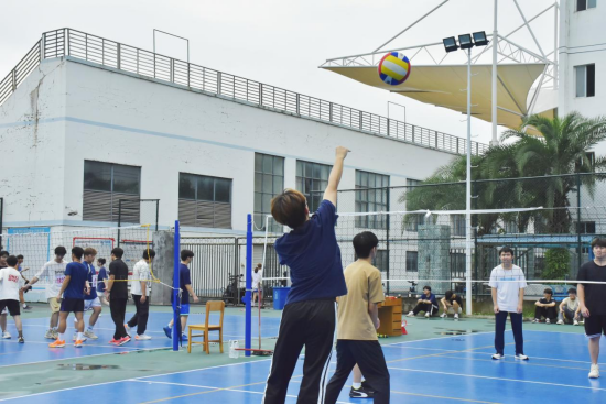 比赛现场气氛热烈,师生们热情高涨。赛场上,双方队员默契配合,发球、传球、扣球,动作矫健有力,精彩瞬间不断。老师们凭借丰富的经验与技巧,展现了专业风采;同学们则以充沛的体力和顽强的斗志,冲击每一局比赛。比赛过程中,加油声、欢呼声此起彼伏,场外观众全神贯注,为参赛选手们加油助威。