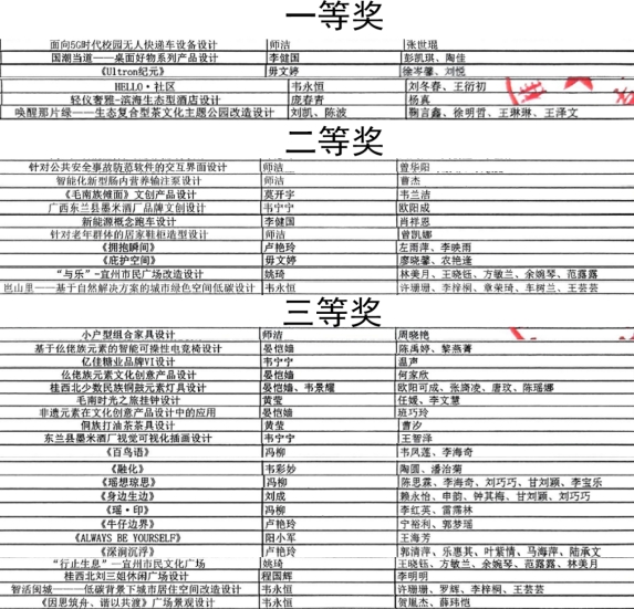大赛是面向广西大学生开展的公益性工业设计创意实践活动,以“设计引领﹒学科融通”为主题开展。在必赢国际bwin领导的带领下,师生积极响应号召组织参赛。并在“产品设计类”、“数字媒体类”、“品牌设计类”、“视觉传达设计”、“服装与服饰设计类”五大参赛类别中充分发挥专业水平,取得了一定的成绩。其中一等奖6项,二等奖10项,三等奖21项。除此之外,师洁老师指导的学生作品成功晋级国赛,期待其取得更好的成绩。